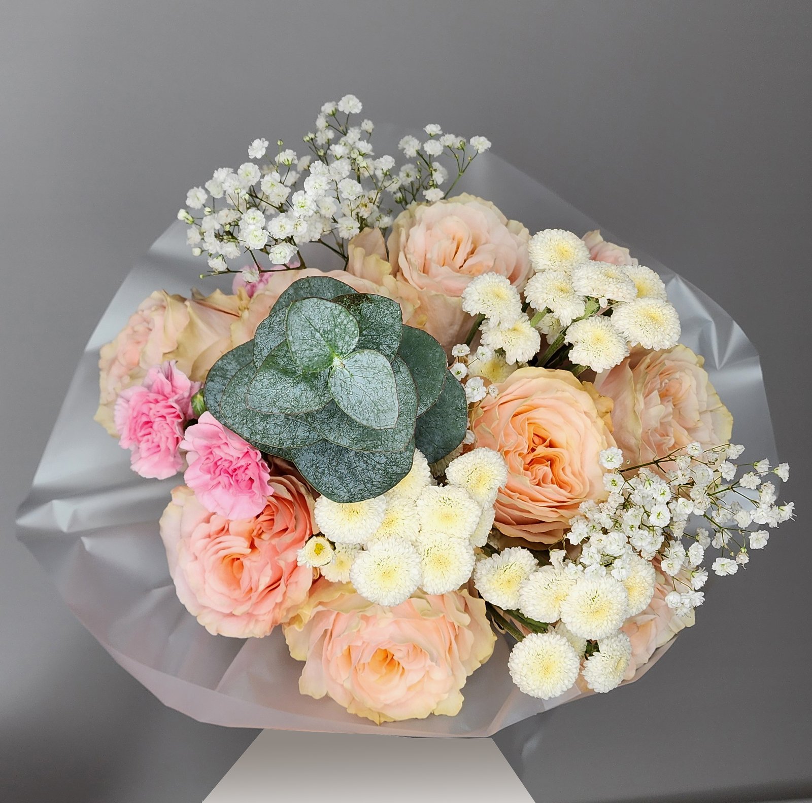 A hand-tied bouquet of peony style roses accented with fluffy white and delicate pink blooms, eucalyptus and subtle greenery. Wrapped in transparent white pater. Blushy Fluff is playful, tender and irresistibly charming – a bouquetthat is soft and cheerful as its name.