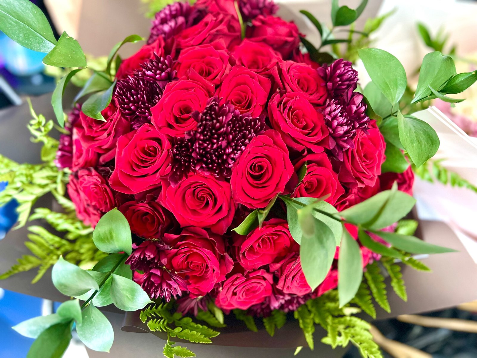 50 Premium red roses intertwined with deep purple and lush greenery, hand-tied into a luxurious bouquet. Presented in sleek black wrapping, Imperial Ruby exudes sophistication, status and bold elegance – a true statement piece for any occasion.
