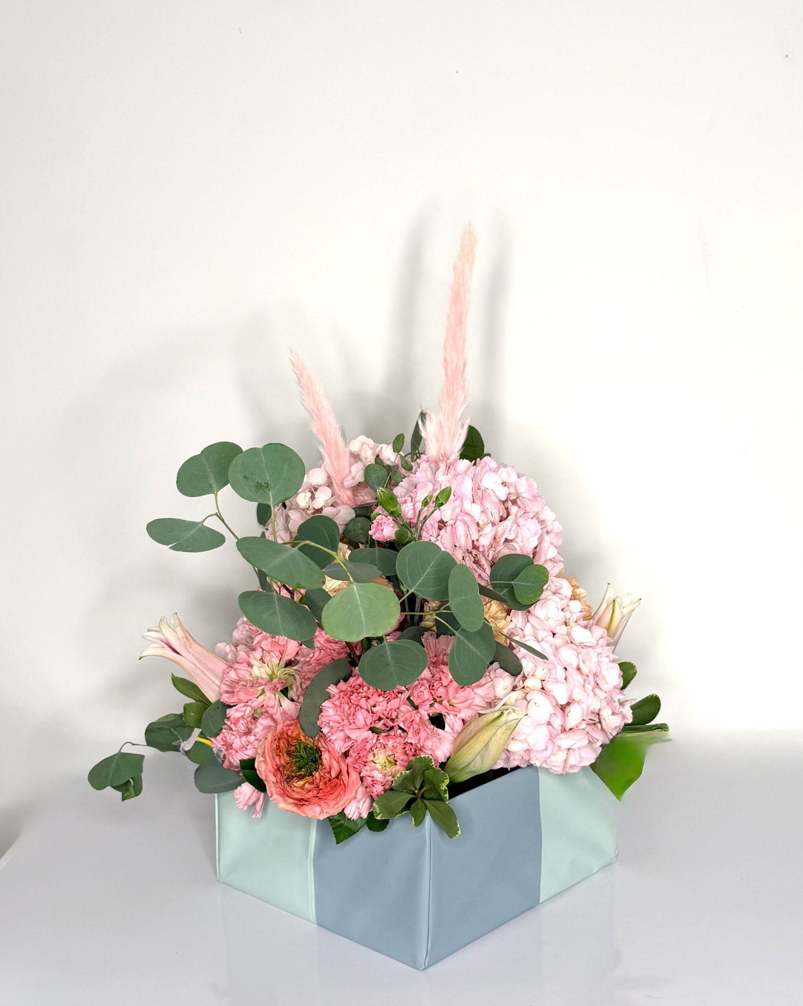 An ocean-colored box holds lush hydrangeas, romantic roses, playful carnations, aromatic eucalyptus and fragrant lilies — creating a dreamy composition full of warmth, emotion and tropical elegance.