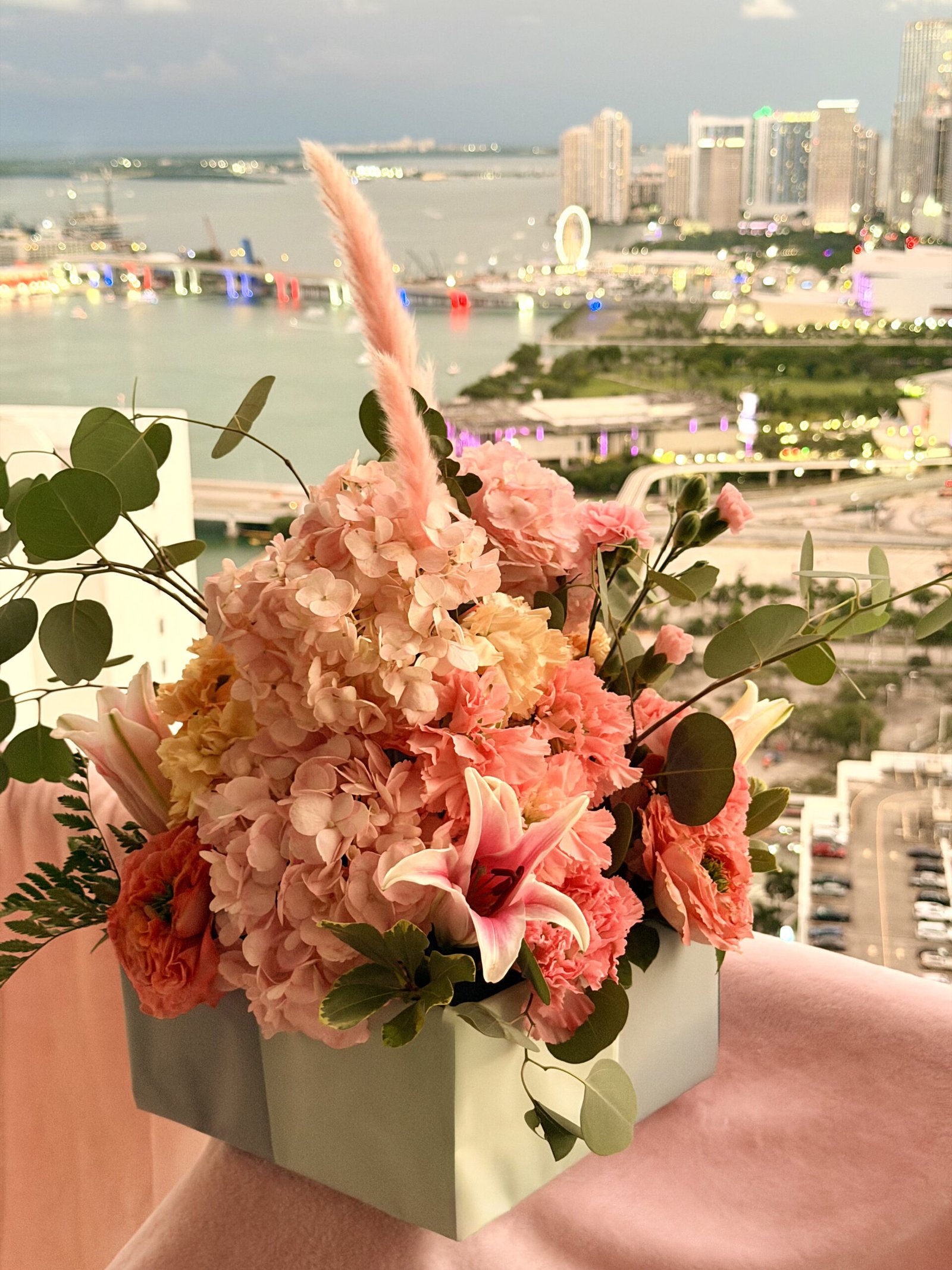 Hand-crafted with intention, this floral box captures that soft magic moment when the Miami sky turns peach-rose and gold before night lights take over the bay.